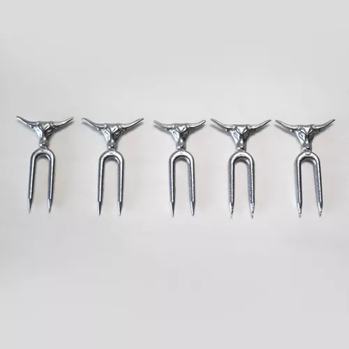 "Apresentamos um conjunto de cinco mini garfinhos para petiscos, cada um feito em alumínio batido e adornado com uma adorável escultura de rosto bovino. Leves, pesando apenas 15g cada e com um comprimento de 7,5cm, esses garfinhos são ideais para servir petiscos de maneira criativa e charmosa."